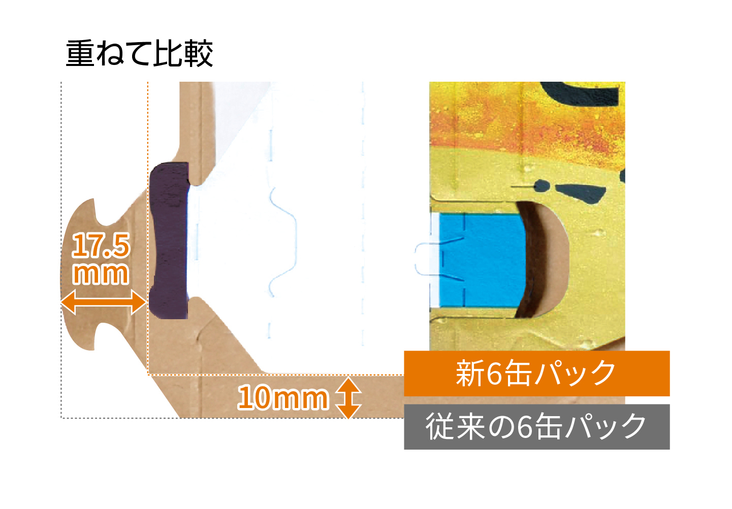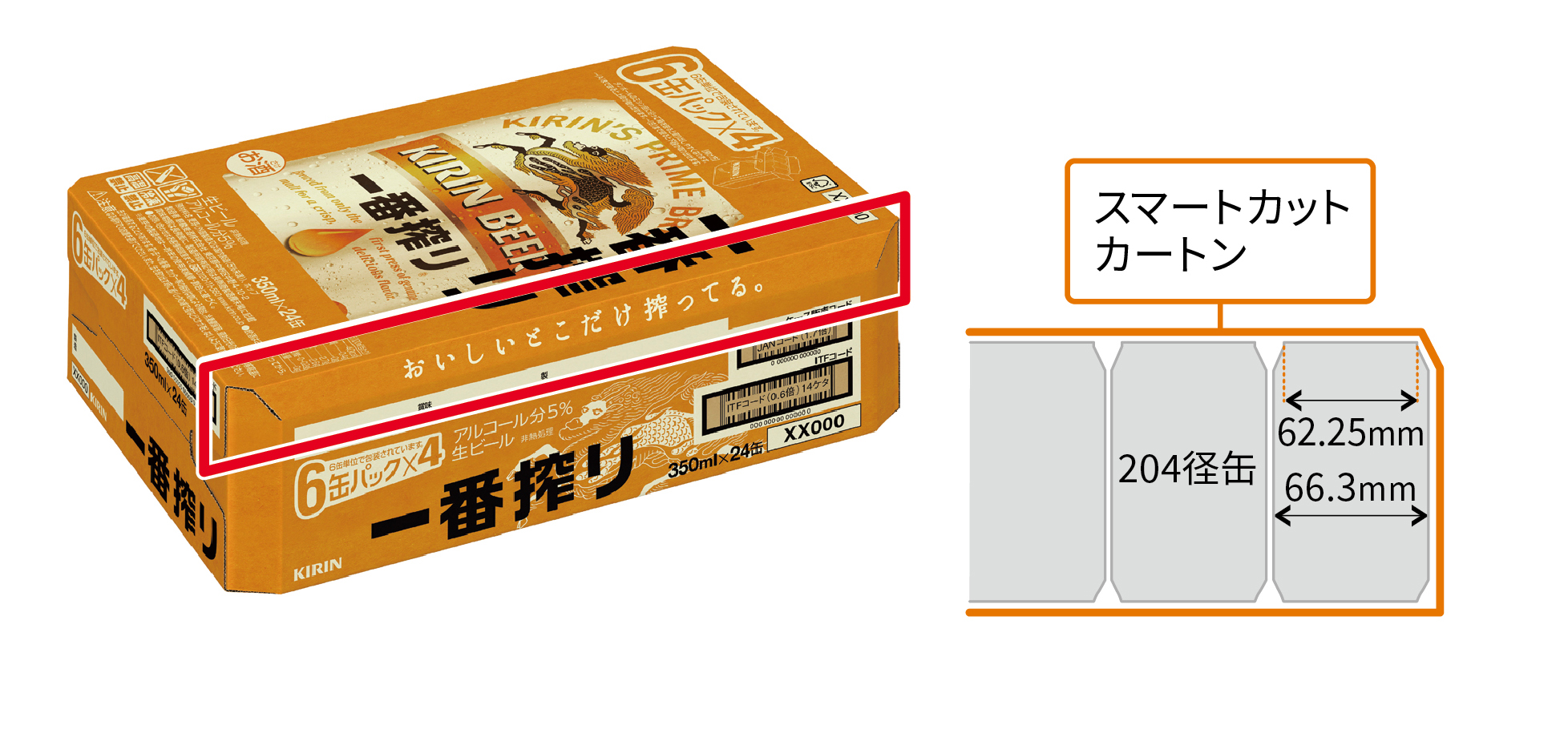 2015年から導入した「スマートカットカートン」は、「コーナーカットカートン」の技術を基に、軽量化に加え、蓋の口径を小さくした204径缶の肩にできる空間に合わせカートン長側面上部の角を切り落とした形状にしたものです。これにより、それまでのコーナーカットカートンより16%軽量化できています。