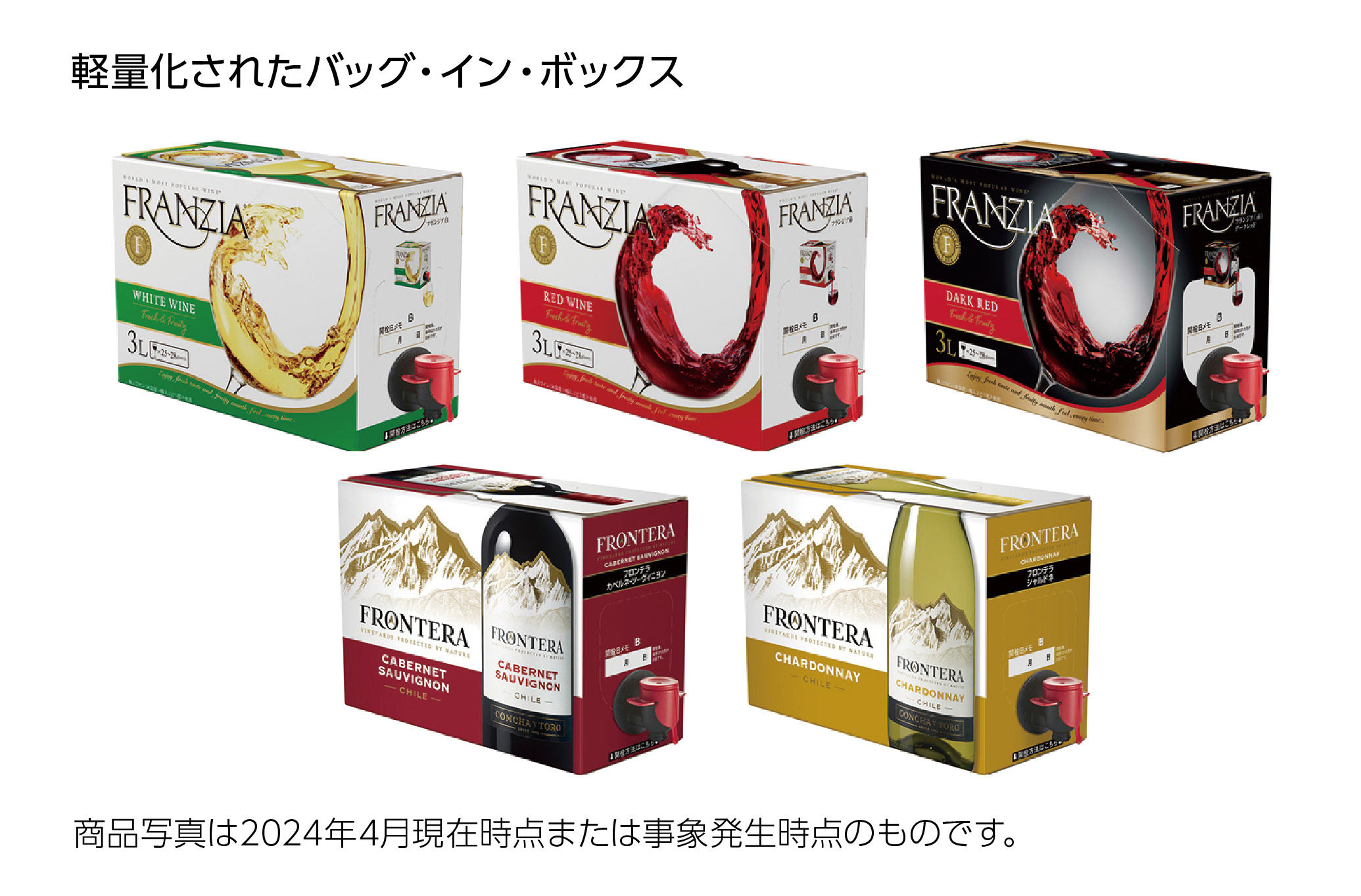 2022年3月からメルシャンが発売したワインの容器も軽量化しています。「フランジア」(赤、白、ダークレッド)のバッグ・イン・ボックスと、「フロンテラ」(カベルネ・ソーヴィニヨン、シャルドネ)のワインフレッシュサーバーの計5種は、外箱に内袋が入ったバッグ・イン・ボックスを採用しています。外箱を190gから143gと約25%の軽量化することで年間約31tの紙資源の削減が可能になります。