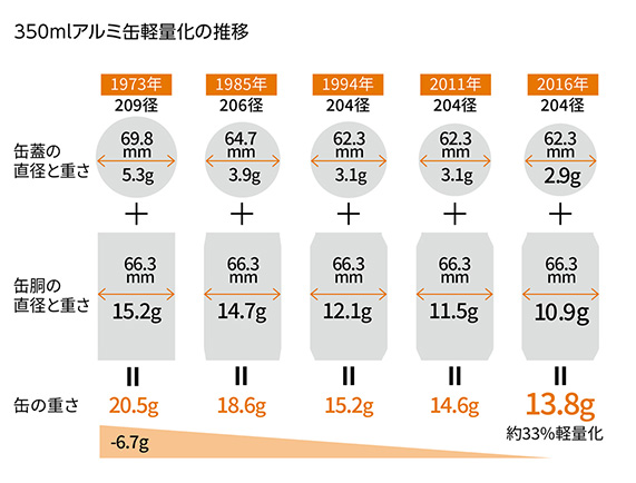 ビール用アルミ缶では、缶蓋の口径を小さくし、胴部の上下部分を絞ることで胴部の重量を削減するとともに胴部の薄肉化を進めることで、「204径缶」は2011年には「209径缶」当時と比べ350mlアルミ缶で約29%の軽量化を実現しました。2016年には資材メーカーと共同で、缶蓋、缶胴の両方を薄肉化したアルミ缶を開発しました。缶全体の重さを14.6gから13.8gとし、約5%(0.8g)軽量化を実現しています。これにより、209径缶と比べて33%(6.7g)の軽量化を果たしました。缶の素材としては、スチールとアルミがあり、どちらも軽量化が必要ですが、特にアルミの場合は製錬に大量の電気が必要なため、GHGのScope3削減に大きく貢献しています。